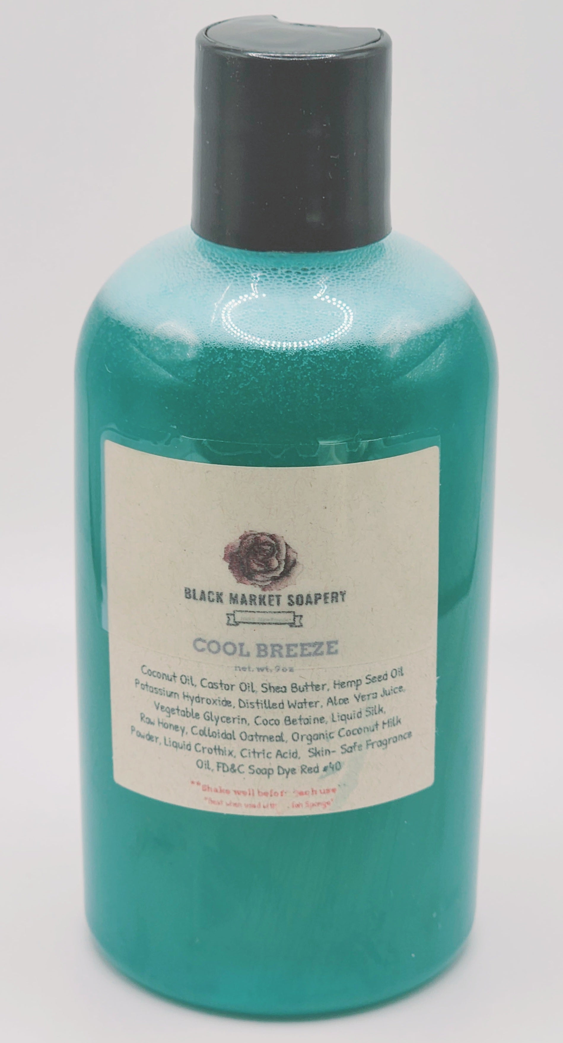 Ingredients: Coconut Oil, Castor Oil, Shea Butter, Hemp Seed Oil, Aloe Vera Juice, Distilled Water, Potassium Hydroxide, Vegetable Glycerin, Coco Betaine, Liquid Silk, Liquid Crothix, Citric Acid, Colloidal Oatmeal, Honey, Skin-Safe Fragrance Oil & FD&C Soap Dye Blue #1.